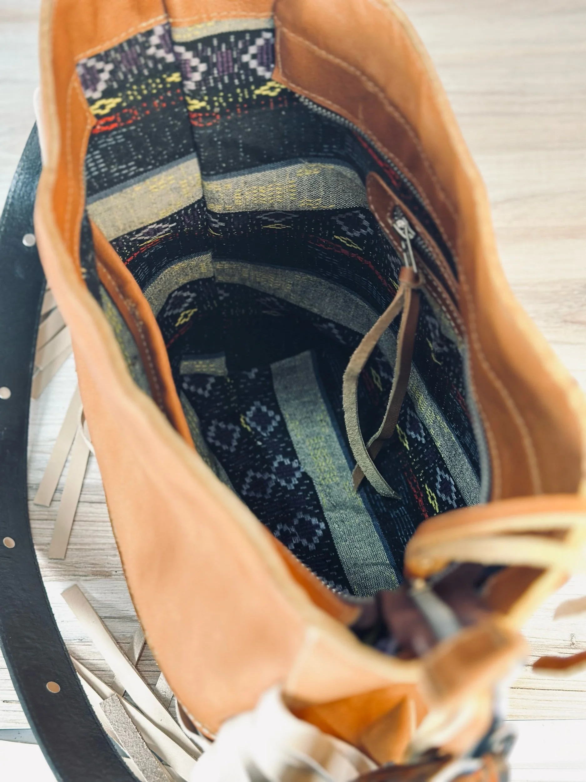 Made with our gorgeous tan leather. It’s a little smoother leather than our last batch and lined with artisanal woven fabric. Made by hand, our bags change slightly with each small batch.