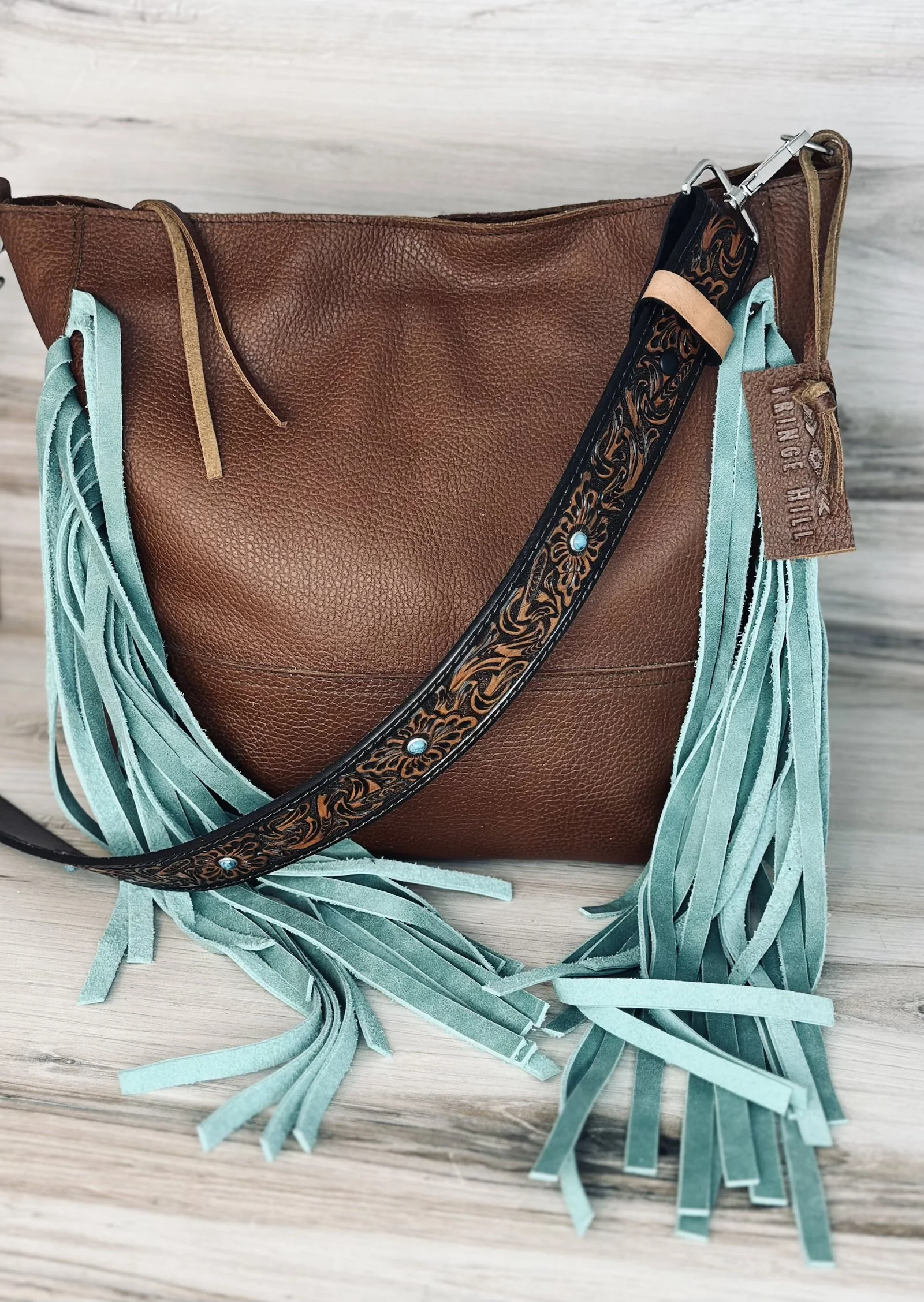 The Fringed Louise Bucket Bag is one of our favorites! It is made with a soft medium weight vintage style hide and beautiful embossed leather detachable strap and zipper closure.
