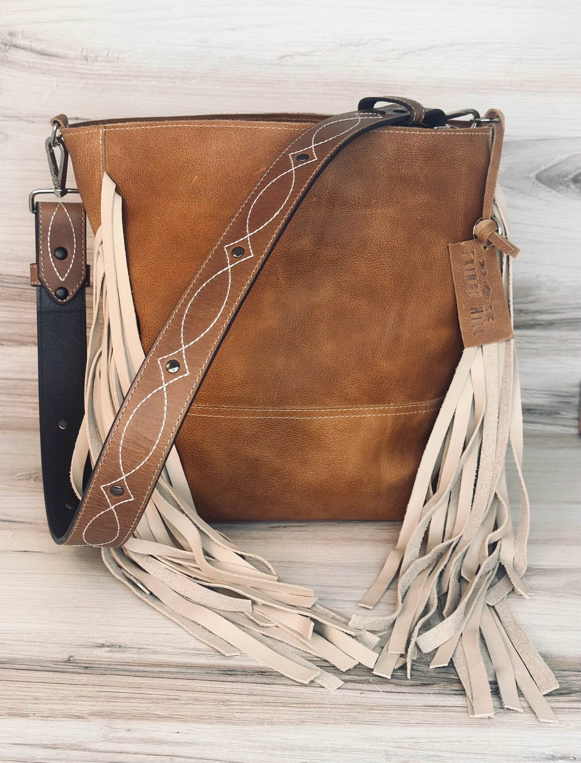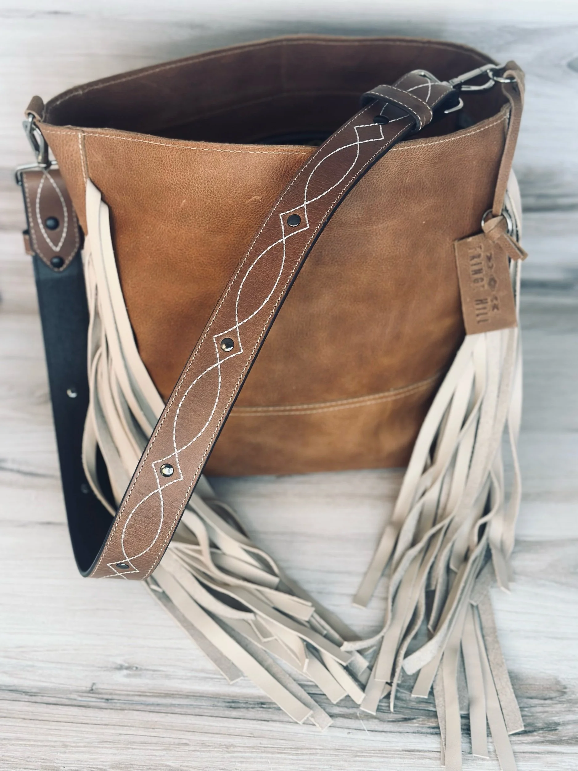 The Fringed Louise Bucket Bag is one of our favorites! It is made with a soft medium weight vintage style hide and beautiful embossed leather detachable strap and zipper closure.